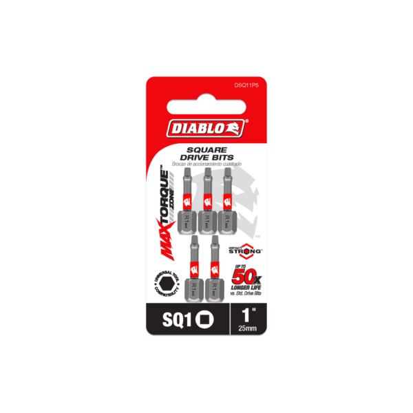 Diablo’s driver bit range of Square bits delivers maximum performance, extreme durability and up to 50X longer life when installing and removing fasteners. An optimized tip design provides a strong, precise grip that reduces wear, stripping and slippage. Torque Resistant Design absorbs torque for less stress at the tip when tightening and removing nuts and screws. This range is Impact Strong™, delivering increased shank stability and durability in cordless and corded impact and drill drivers.