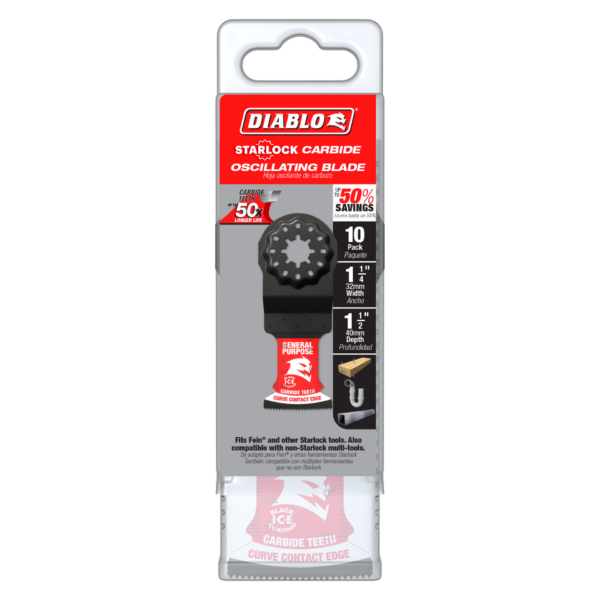 Diablo’s AMPED™ Demo Demon™ Starlock carbide oscillating blades feature application-specific designs that deliver extreme durability and superior cutting life in general purpose cuts: nail-embedded wood, clean wood, metal and plastics. High performance TiCo Hi-Density carbide teeth deliver an unmatched up to 50X longer cutting life versus standard bi-metal blades. Curve contact edge creates a pilot for precise, clean plunge cuts with less vibration. An optimized blade design and Black I.C.E. (Industrial Cooling Element) coating protects cutting edge against wear for extreme durability and longer blade life. Tool free quick-change interface fits Fein and other Starlock tools; also compatible with non-Starlock multi-tools.