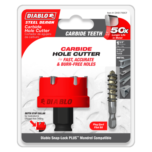 Diablo’s high-performance Steel Demon™ carbide teeth hole cutters deliver 50X longer cutting life, faster cutting performance and maximum productivity. An optimized carbide tooth geometry provides fast, burr-free holes that require virtually no rework. The depth stop collar maximizes productivity by providing a controlled drilling experience and limiting drilling depth. The combination of a tool-free plug ejection system and spring-loaded plug eject Cobalt pilot bit makes plug removal fast and efficient. Diablo’s hole cutters are compatible with Diablo’s Snap-Lock Plus™ mandrel resulting in quick, easy and effortless cup changes.