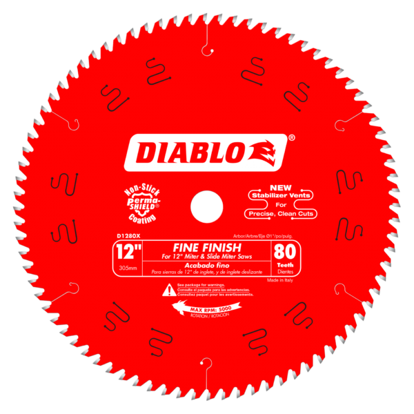 Diablo’s Fine Finish Saw Blades for Wood let trim crews get the most out of sliding or “chop” style miter saws, as well as jobsite or workshop table saws. The special cutting geometry and high tooth count produce extremely smooth cuts while minimizing “grabbing” or blowout. Diablo’s particular blade is the ideal choice for trim carpenters because it leaves a smooth surface that requires little to no sanding. It’s ideal for crosscutting oak, pine, melamine, plywood, and moulding. **Technical Specifications:** – Brand: Diablo – Diameter: 12″ – Tooth Count: 80 Hi-ATB – Kerf: .118″ – Application: Fine Finish Wood Cutting