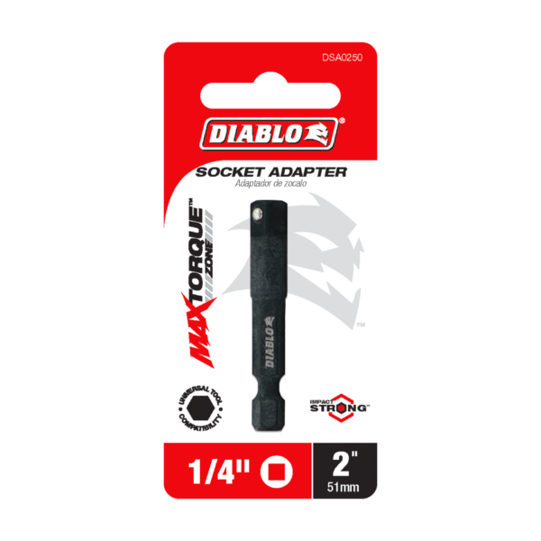 Diablo’s socket adapters deliver ultimate performance and maximum durability in converting impact and standard drill drivers into socket wrenches. An ultra-strength pin prevents slippage by securely griping sockets when tightening and removing nuts and bolts. These hi-performance adapters are compatible with standard and deep well sockets and allows users to convert impact and drill drivers into square socket wrenches. Torque Resistant Design absorbs torque for less stress on the adapter and the socket. This range is Impact Strong™, delivering increased shank stability and durability in cordless and corded impact and drill drivers. Only suitable for applications below 80 Nm. For heavier applications, such as wheel changing, we recommend using sockets directly with an impact wrench.
