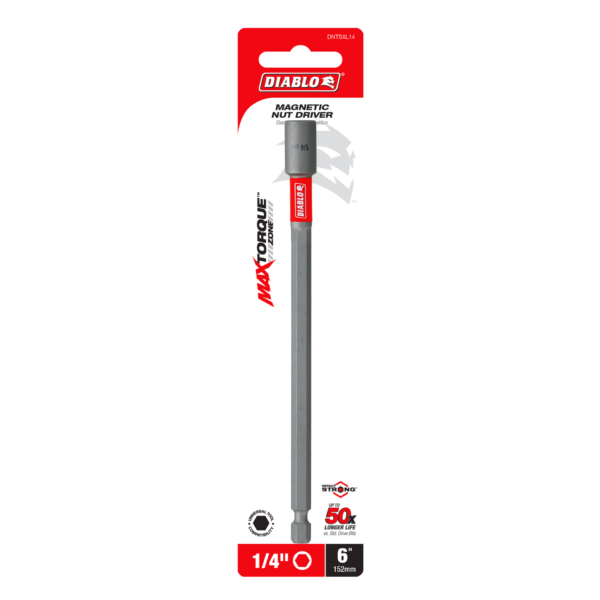 Diablo’s range of magnetic nut drivers delivers maximum performance and extreme durability in driving hex nuts or self-tapping screws. A high-strength, permanent magnet provides a secure, anti-wobble grip when fastening screws and nuts into a variety of applications. MaxTorque Zone ultimate torque resistance absorbs torque for less stress at the tip when tightening and removing nuts and screws. This range is Impact Strong™, delivering increased shank stability and durability in cordless and corded impact and drill drivers.