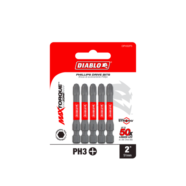 Diablo’s driver bit range of Phillips bits delivers maximum performance, extreme durability and up to 50X longer life when installing and removing fasteners. An optimized tip design provides a strong, precise grip that reduces wear, stripping and slippage. MaxTorque Zone delivers ultimate torque resistance by absorbing torque, creating less stress at the tip when tightening and removing nuts and screws. This range is Impact Strong™, delivering increased shank stability and durability in cordless and corded impact and drill drivers.