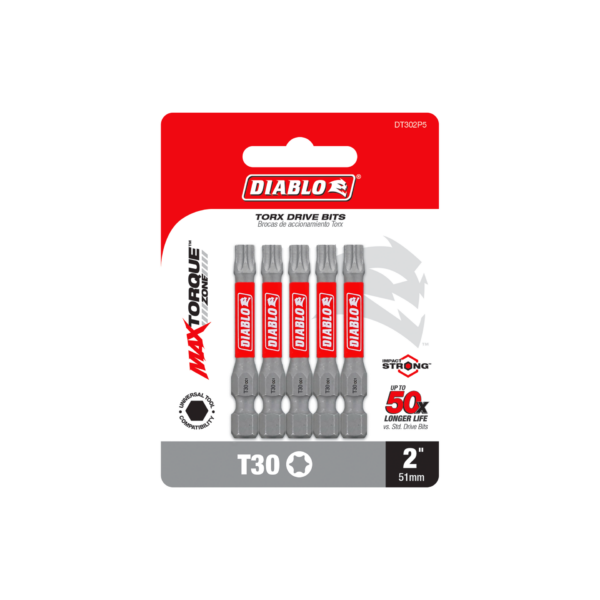 Diablo’s range of Torx driver bits delivers maximum performance, extreme durability and up to 50X longer life when installing and removing fasteners. An optimized tip design provides a strong, precise grip that reduces wear, stripping and slippage. MaxTorque Zone delivers ultimate torque resistance by absorbing torque, creating less stress at the tip when tightening and removing nuts and screws. This range is Impact Strong™, delivering increased shank stability and durability in cordless and corded impact and drill drivers.