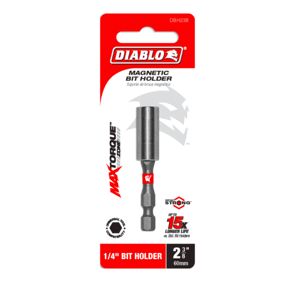 Diablo’s magnetic drive bit holders deliver ultimate performance and maximum durability in extending the drill’s reach in hard to access areas. A high-strength, permanent magnet provides a secure, anti-wobble grip when fastening screws and nuts into a variety of applications. MaxTorque Zone ultimate torque resistance absorbs torque for less stress on the holder and the bit. This range is Impact Strong™, delivering increased shank stability and durability in cordless and corded impact and drill drivers.