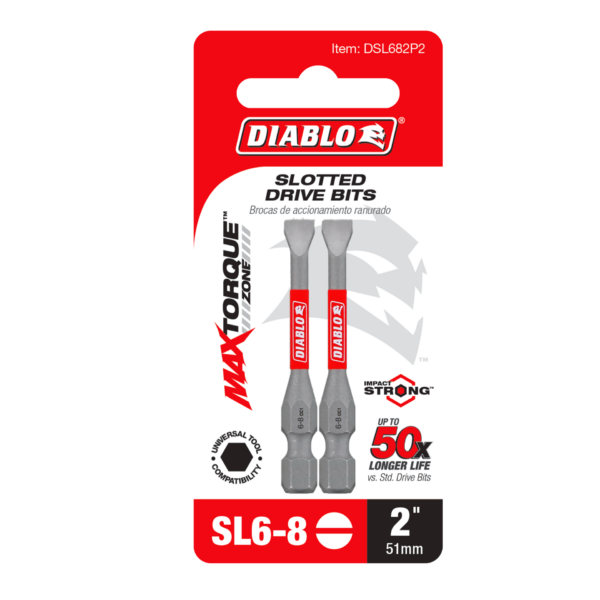 Diablo’s driver bit range of Slotted bits delivers maximum performance, extreme durability and up to 50x longer life when installing and removing fasteners. An optimized tip design provides a strong, precise grip that reduces wear, stripping and slippage. T MaxTorque Zone delivers ultimate torque resistance by absorbing torque, creating less stress at the tip when tightening and removing nuts and screws. This range is Impact Strong™, delivering increased shank stability and durability in cordless and corded impact and drill drivers.