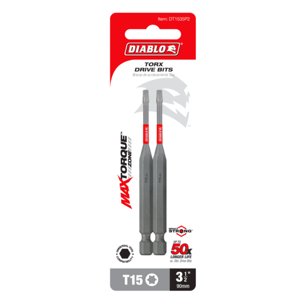 Diablo’s driver bit range of Torx bits delivers maximum performance, extreme durability and up to 50x longer life when installing and removing fasteners. An optimized tip design provides a strong, precise grip that reduces wear, stripping and slippage. Torque Resistant Design absorbs torque for less stress at the tip when tightening and removing nuts and screws. MaxTorque Zone delivers ultimate torque resistance by absorbing torque, creating less stress at the tip when tightening and removing nuts and screws.