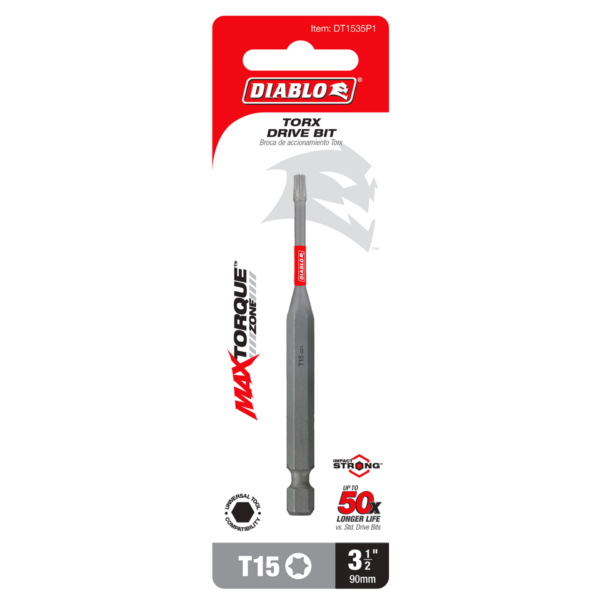 Diablo’s driver bit range of Torx bits delivers maximum performance, extreme durability and up to 50x longer life when installing and removing fasteners. An optimized tip design provides a strong, precise grip that reduces wear, stripping and slippage. MaxTorque Zone delivers ultimate torque resistance by absorbing torque, creating less stress at the tip when tightening and removing nuts and screws. This range is Impact Strong™, delivering increased shank stability and durability in cordless and corded impact and drill drivers.