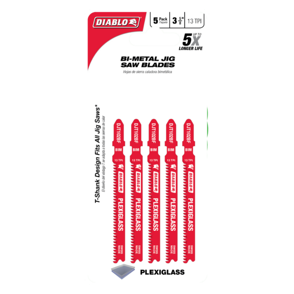Diablo’s bi-metal teeth jig saw blades are specifically designed for maximum durability and longer life in plexiglass applications. These high-performance blades feature an ultra-hardened cutting edge to deliver up to 5X longer life than standard blades. The optimized blade design and Perma-SHIELD® non-stick coating reduces heat for melt-free cuts in plexiglass. T-shank design fits all combo and most U-shank cordless and corded jig saws.