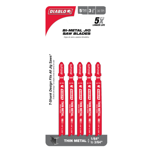Diablo’s bi-metal teeth jig saw blades are specifically designed for maximum durability, longer life and speed in thin metal applications ranging from 1/64” to 3/64” thickness. These high-performance blades feature an ultra-hardened cutting edge to deliver up to 5X longer life than standard blades. A back taper blade design and Perma-SHIELD® non-stick coating reduces heat and pitch build up for fast and clean cuts in metal. T-shank design fits all combo and most U-shank cordless and corded jig saws.