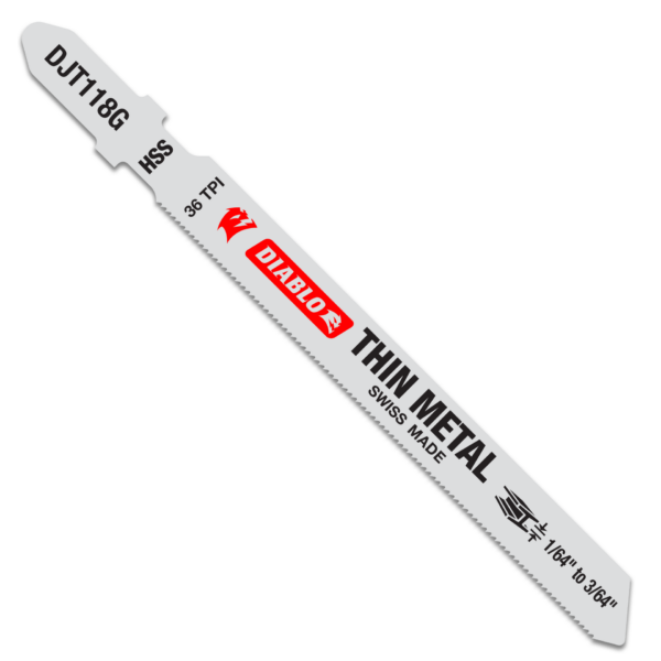 Diablo’s high speed steel jig saw blades are specifically designed for high-performance cutting in thin metal applications. A high speed steel cutting edge and optimized tooth design provide fast cuts and stability in metal from 1/64”-3/64”. T-shank design fits all combo and most U-shank cordless and corded jig saws.