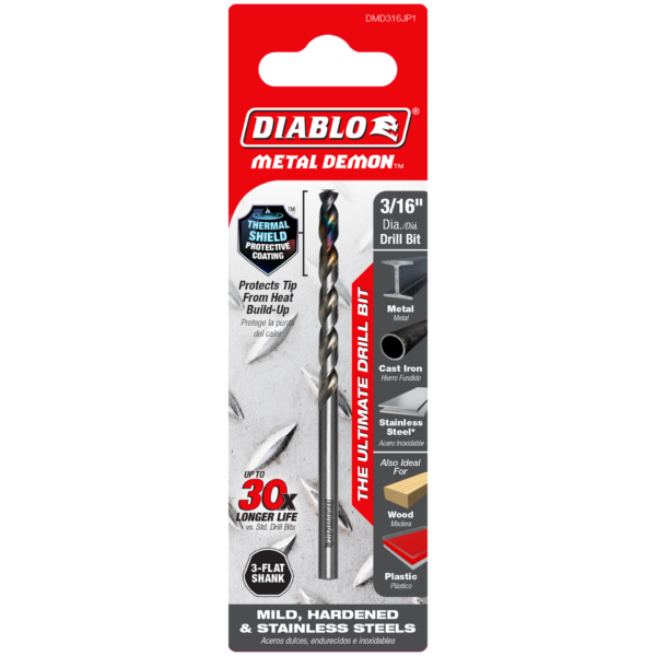 Diablo’s Metal Demon™ Drill Bits redefine metal drilling with the industry’s first three-in-one bit to tackle all metals: mild, hardened, and stainless steels. Long-gone are the days where professionals must purchase and carry multiple bit types (Titanium, Cobalt, and Black Oxide), the Metal Demon™ bit’s exclusive design brings a one-bit solution for any application ensuring maximum durability, speed, precision, and productivity. Diablo’s proprietary Thermal Shield Protective Coating™ creates a multi-layered protective barrier around the tip to shield against heat, maximizing durability and increasing the bit’s life up to 30-times longer than Titanium, Cobalt, or Black Oxide metal drill bits. Cutting Edge™, an automated precision CNC grinding process, ensures strict industrial standard angle tolerances that create a cutting motion to minimize bit wear allowing for faster hole drilling up to 2-times than other bits. A 130-degree Hybrid Split Point Tip design creates fast, on-point starts in both stationary and handheld drills. Productivity is now a concern of the past. Metal Demon’s ability to drill up to 50% more holes per battery charge ensures professionals can complete more in less time. An optimized flute design removes metal debris faster, keeping the tip cooler for ultimate strength and durability in all metal drilling applications. The 3-Flat shank design prevents slippage for accurate hole drilling.