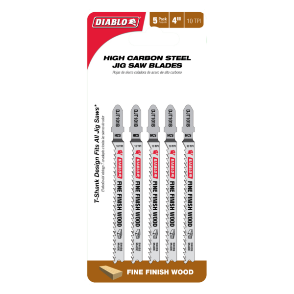 Diablo’s high carbon steel jig saw blades are specifically designed for high-performance cutting in fine finish wood applications. A high carbon steel cutting edge provides fast and effortless cuts in soft materials. Optimized tooth design for clean bottom finishes. T-shank design fits all combo and most U-shank cordless and corded jig saws.