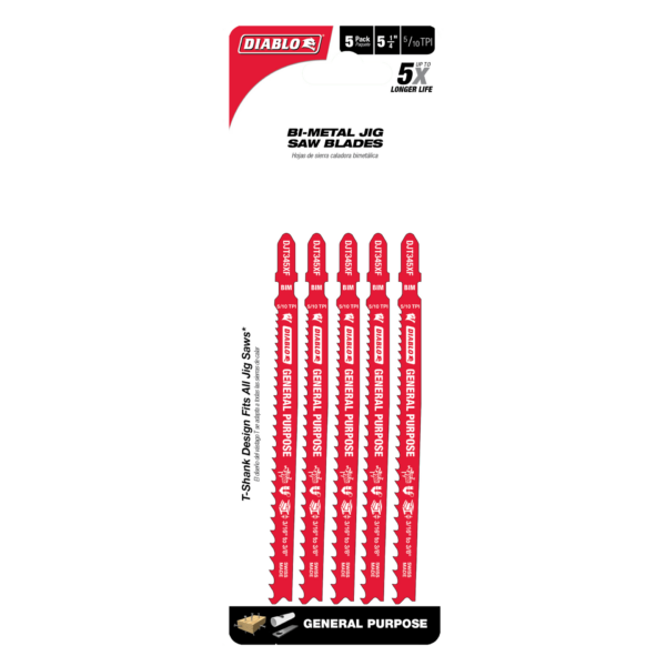 Diablo’s bi-metal teeth jig saw blades are specifically designed for maximum durability and longer life in wood, metal and plastic applications. These high-performance blades feature an ultra-hardened cutting edge to deliver up to 5X longer life than standard blades. The optimized blade design and Perma-SHIELD® non-stick coating reduces heat and pitch build up for effortless, clean cuts. T-shank design fits all combo and most U-shank cordless and corded jig saws.