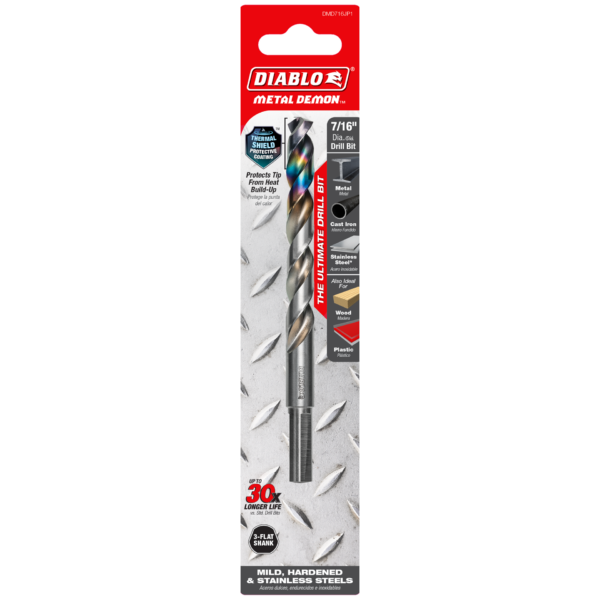 Diablo’s Metal Demon™ Drill Bits redefine metal drilling with the industry’s first three-in-one bit to tackle all metals: mild, hardened, and stainless steels. Long-gone are the days where professionals must purchase and carry multiple bit types (Titanium, Cobalt, and Black Oxide), the Metal Demon™ bit’s exclusive design brings a one-bit solution for any application ensuring maximum durability, speed, precision, and productivity. Diablo’s proprietary Thermal Shield Protective Coating™ creates a multi-layered protective barrier around the tip to shield against heat, maximizing durability and increasing the bit’s life up to 30-times longer than Titanium, Cobalt, or Black Oxide metal drill bits. Cutting Edge™, an automated precision CNC grinding process, ensures strict industrial standard angle tolerances that create a cutting motion to minimize bit wear allowing for faster hole drilling up to 2-times than other bits. A 130-degree Hybrid Split Point Tip design creates fast, on-point starts in both stationary and handheld drills. Productivity is now a concern of the past. Metal Demon’s ability to drill up to 50% more holes per battery charge ensures professionals can complete more in less time. An optimized flute design removes metal debris faster, keeping the tip cooler for ultimate strength and durability in all metal drilling applications. The 3-Flat shank design prevents slippage for accurate hole drilling.